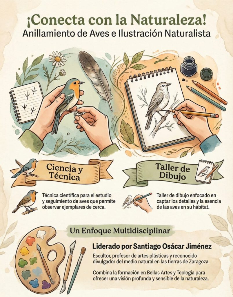 Identificación de especies y explicación del ecosistema de los galachos / Sesión práctica de anillamiento / Juego de pistas por la mejana / Elaboración del cuaderno de campo / Talleres de huellas y cartografía / Comida, descanso y retorno